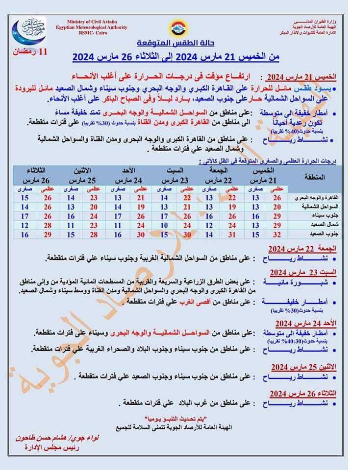 وكشفت هيئة الأرصاد الجوية في تقرير صادر عنها، أنّ موعد ارتفاع درجات الحرارة سيكون اليوم الخميس.