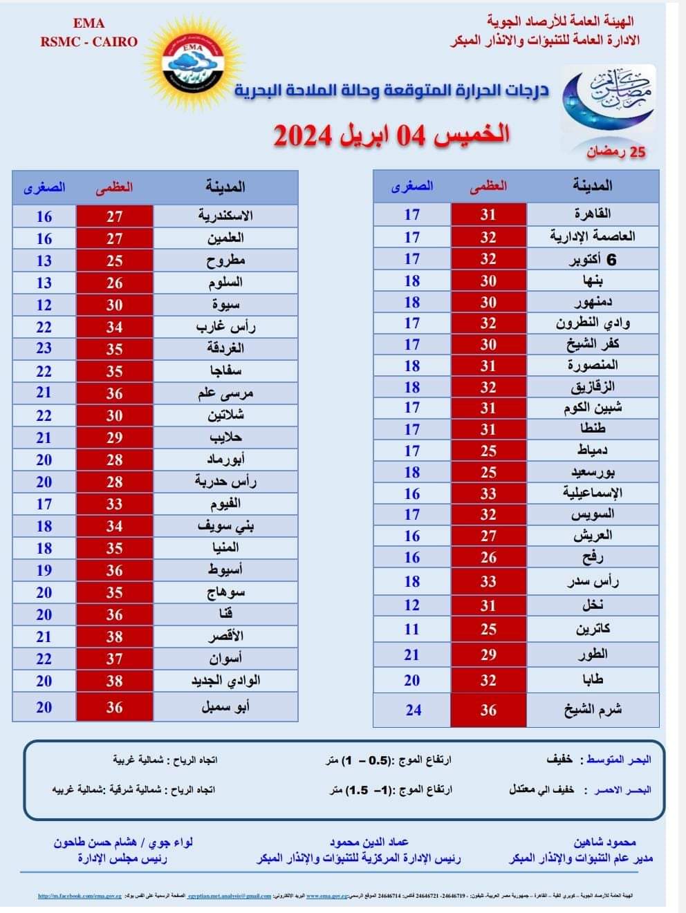 ونسوق في التقرير التالي درجات الحرارة المتوقعة اليوم في محافظات مصر: