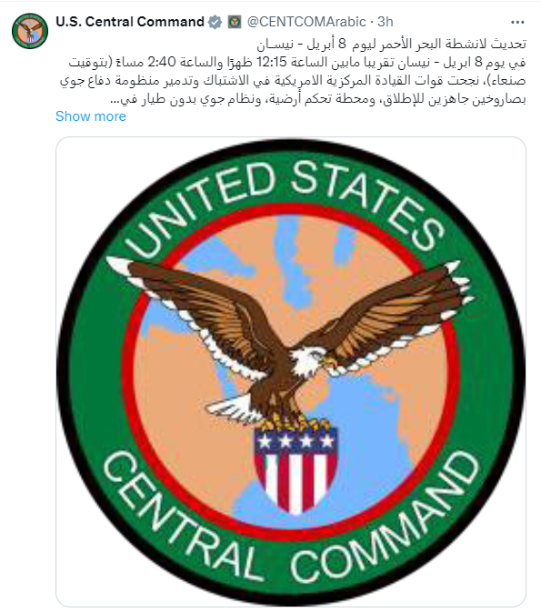 وأعلنت القيادة عبر صفحتها الرسمية بموقع التواصل الاجتماعي “إكس” تويتر سابقًا، أخر تحديث لانشطتها في البحر الأحمر، موضحة أنها قامت أمس 8 ابريل ما بين الساعة 12:15 ظهرًا والساعة 2:40 مساءً “بتوقيت صنعاء”، تلك المنظومة الدفاعية ومحطة المراقبة الحوثية.