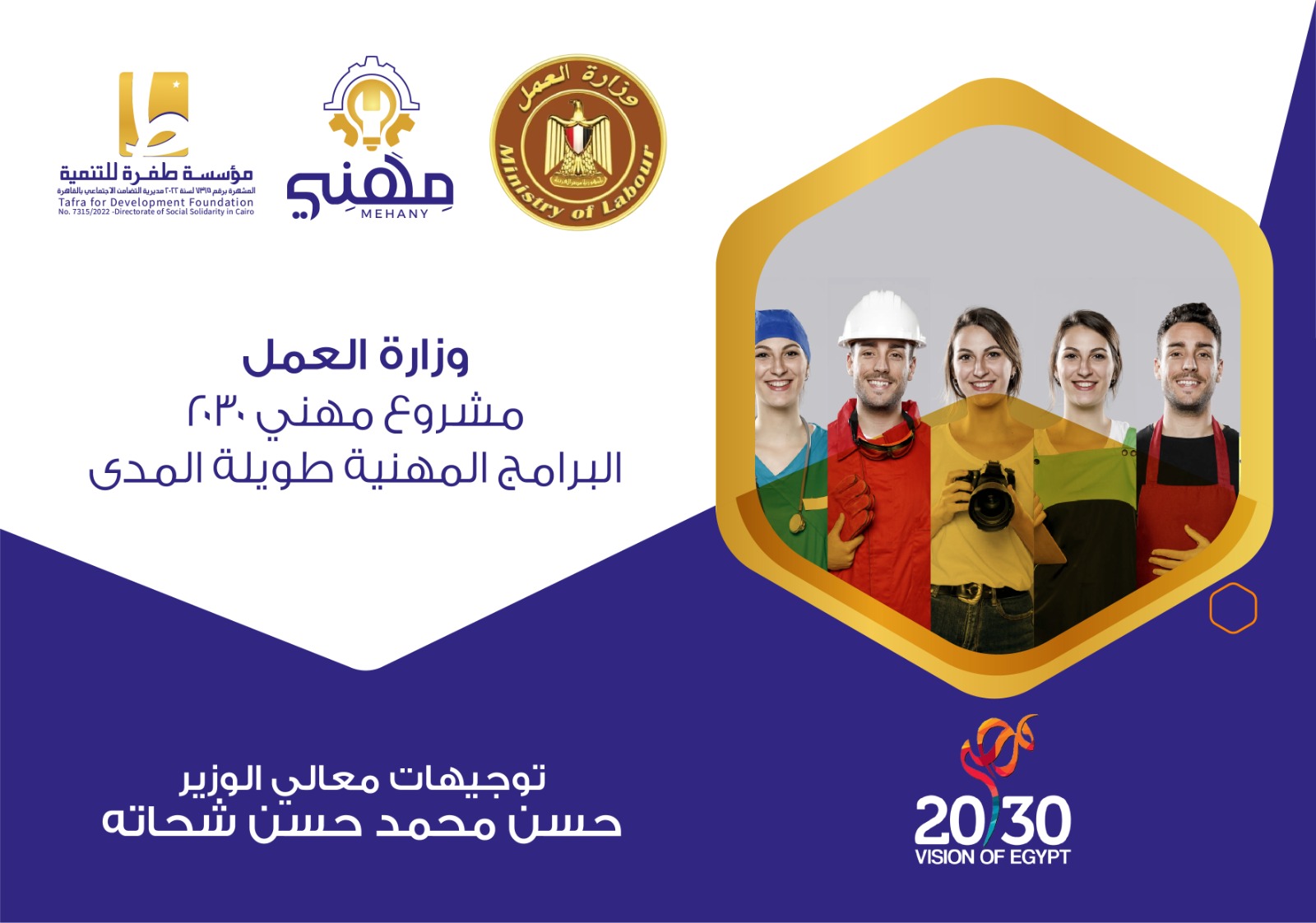 وفي إطار رؤية وزارة العمل، وأهدافها ودورها في رسم السياسة القومية لتدريب وتأهيل الشباب من الجنسين لسد احتياجات سوق العمل المحلي والدولي، والإشراف على تنفيذها من خلال مراكز التدريب المهني علي مستوى الجمهورية، والحفاظ على معايير الجودة لقياس المهارة والأداء، لضمان عِمالة مُؤهلة للتشغيل طبقا لاحتياجات سوق العمل،تم إطلاق مشروع “مهني 2030” بالتعاون مع مؤسسة طفرة للتنمية، لتنفيذ البرامج المهنية طويلة المدى التي تقدم بفترة زمنية تتراوح من “3 – 12 شهر”، وذلك في مجموعة من التخصصات هي: أعمال المساحة والإنشاءات، وإدارة الأعمال والسكرتارية، والصحافة والإعلام، وتكنولوجيا المعلومات، ومساعد الخدمات الصحية، والخدمات البترولية وحفر الأبار، والسياحة والفنادق، والتبريد والتكييف، والصناعات الغذائية، والهندسة الالكترونية، والتفصيل والخياطة، والتربية والرعاية المنزلية.