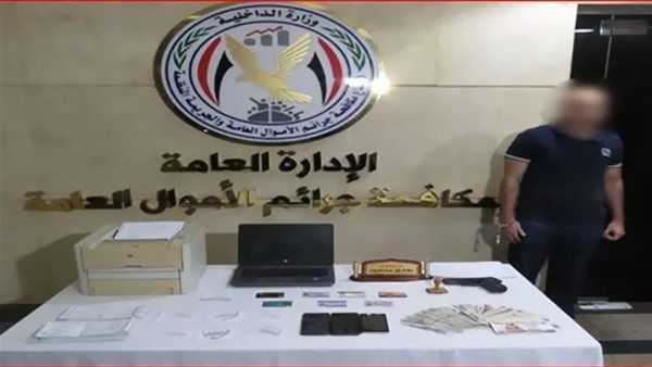 عقب تقنين الإجراءات تم إستهداف المذكور وأمكن ضبطه.. وعثر بحوزته على (3 هاتف محمول – جهاز حاسب آلى محمول “لاب توب”- ماكينة طباعة- عدد 5 كارنيهات “مزورة” بإسم وصورة المتهم بالصفات المنتحلة منسوب صدورها لعدة جهات مختلفة- خاتم أكلاشيه- طبنجة صوت – مبلغ مالى “من متحصلات نشاطه الإجرامى”) وبفحص هواتف المحمول وجهاز الحاسب الآلى تبين إحتوائها على دلائل تؤكد نشاطه الإجرامى.